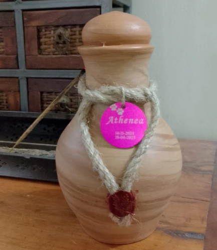 Este recuerdo puede entregarse junto al ánfora y la medalla, y se presenta en un formato delicado, ideal para conservar en casa o regalar a un ser querido que compartió ese vínculo especial.